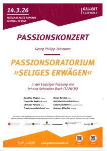 - Andreas Mitschke, Christian Pohlers Tenor, Diogo Mendes Bariton, Dorothea Wagner Sopran, Friedemann Meinhardt Tenor, Friederike Beykirch, Gellert Ensemble, Georg Philipp Telemann, Johann Sebastian Bach, Leipzig, Passion, Sachsen, Wolf Matthias Friedrich